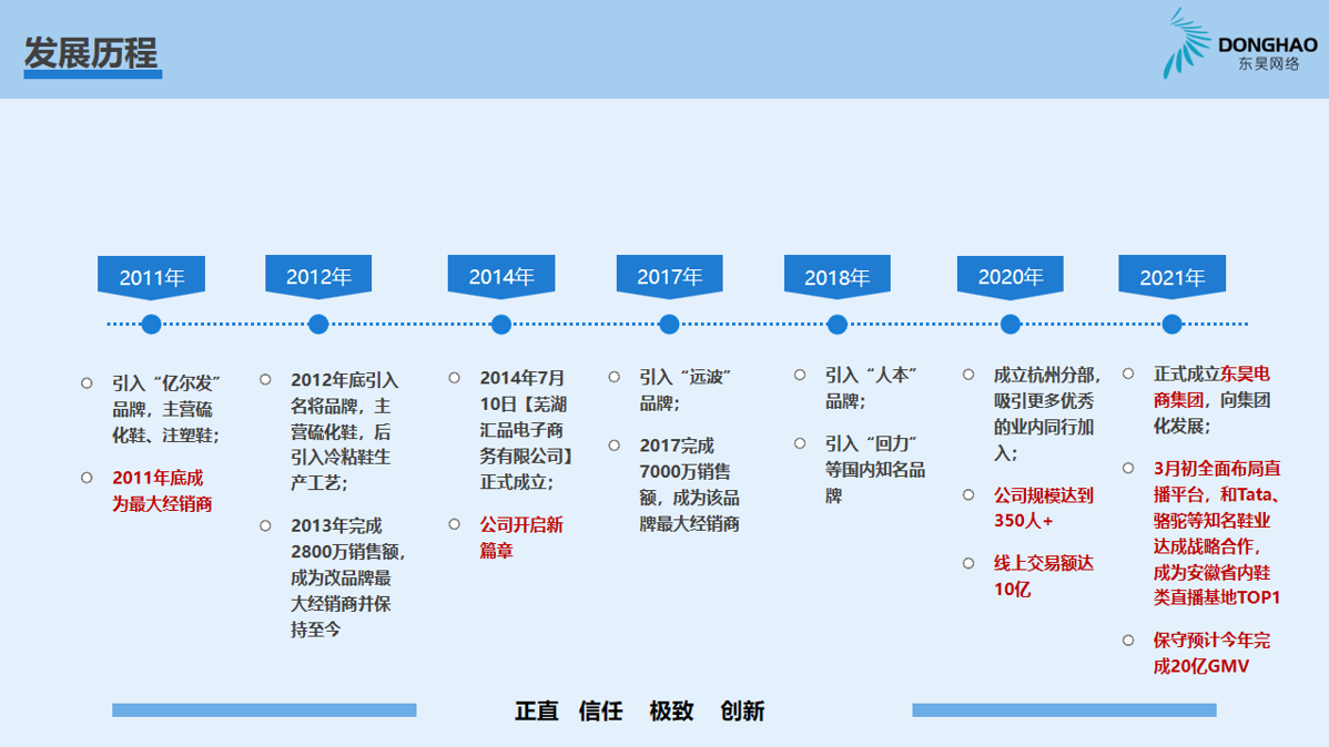 蕪湖東昊網(wǎng)絡(luò)科技有限公司,成立于 2014 年,是一家以互聯(lián)網(wǎng)平臺銷售為核心的電子商務運營商,公司成立以來,始終專注于休閑運動鞋的互聯(lián)網(wǎng)銷售業(yè)務,產(chǎn)品線覆蓋硫化鞋、注塑鞋、冷粘鞋,在互聯(lián)網(wǎng)二級類目單品牌排名前三,綜合成績排名TOP1;